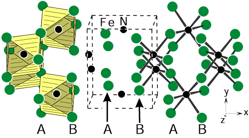 Figure 25: Crystal structure of x-Fe 2N. The iron atoms form hexagonal close-packed layers which extend along the yz-plane of this orthorhombic structure (space group Pbcn). In the x direction these planes have the stacking sequence AB, AB. Hence, the iron atoms form a distorted hexagonal close-packed arrangement where the nitrogen atoms fill half of the octahedral voids.