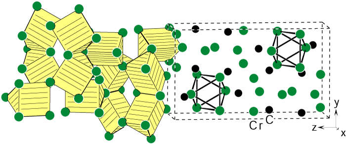 Figure 18: Crystal structure of orthorhombic Cr7C3 (space group Pnma). The carbon filled trigonal prisms are emphasized.